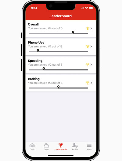All enrolled drivers are ranked for overall safe driving, speeding, braking and phone use. The safer you drive, the higher you rank.